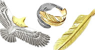 【フェザー】:ネイティブアメリカンにとって神聖な存在であるイーグルの羽根がモチーフ。細部までリアルに表現されたフェザーはペンダントトップやリング、ブレスレット、ピアスなどラインナップも多く人気です。